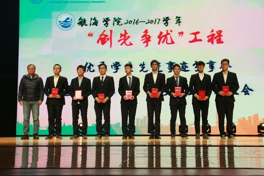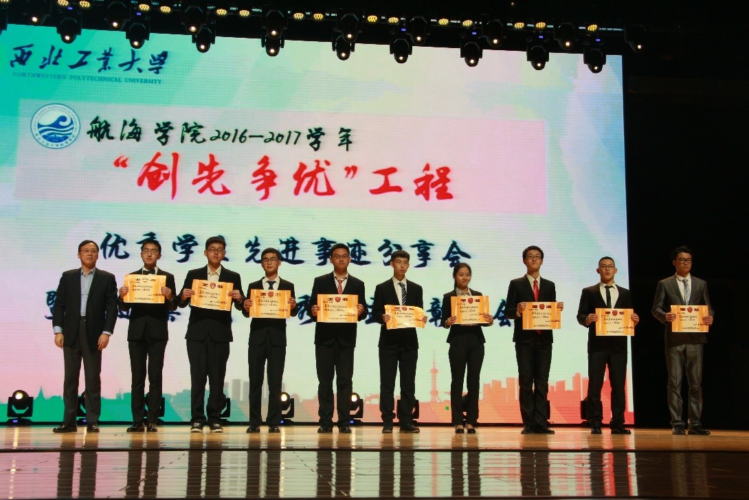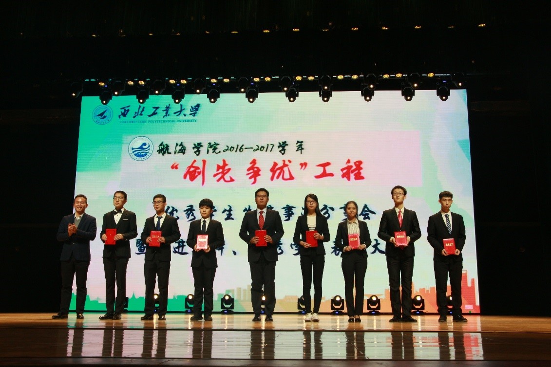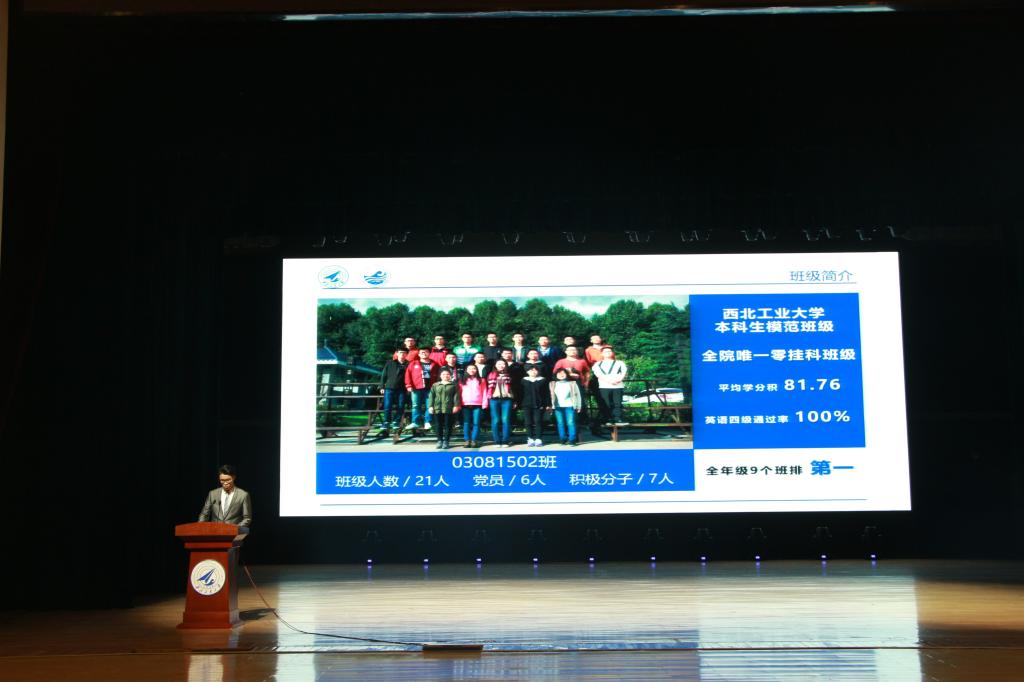在庄严的国歌声中,大会正式开始。副院长王惠刚首先宣读了《关于表彰2016-2017学年学生先进集体、优秀学生和专项奖学金获得者的决定》。伴随着全场热烈的掌声,本科生模范班级(03081502班)代表谢世伟上台进行了学习生活故事分享,他对班集体建设的认知与体会使我们深受触动,“家文化”的建设理念更是值得我们学习。随后,由潘光老师为各个本科生、研究生先进班级颁奖。