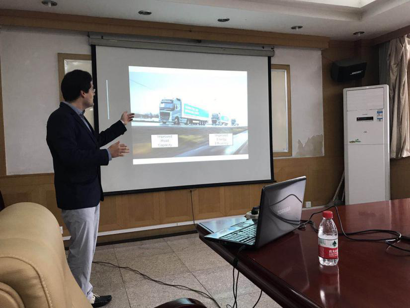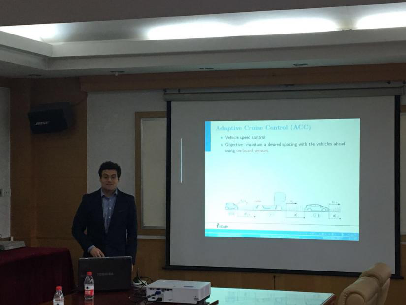 报告会过程中,Simone Baldi博士首先介绍了智能车队控制在提高道路通行能力和运输安全性方面的优势,并给出了智能车队协同自适应巡航控制问题一般形式。随后重点针对存在异构车型和车间通讯丢失情况,提出了自适应切换控制方法来保证车队的队形稳定性,并通过图片和动画等形式生动地展示了控制效果。