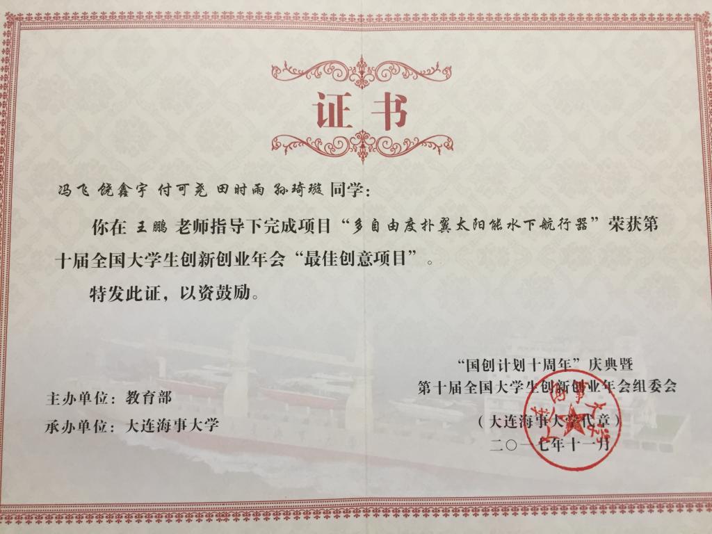 11月17-19日,由教育部主办、大连海事大学承办的“2017国创计划十周年庆典暨第十届全国大学生创新创业年会”在大连海事大学召开,我院“多自由度扑翼太阳能水下航行器”、“基于Rasberry Pi的多功能可变性自主越障机器人”、“单双自由度扑翼运动的LBM数值模拟”和“基于八旋翼无人机的实用技术转化”四个项目入选。其中“多自由度扑翼太阳能水下航行器”项目荣获“最佳创意项目”,并在本届年会上进行项目展示。该项目的指导教师为我院王鹏教授,我院学生冯飞、饶鑫宇、付可尧、田时雨、孙琦璇五位同学为项目小组成员。